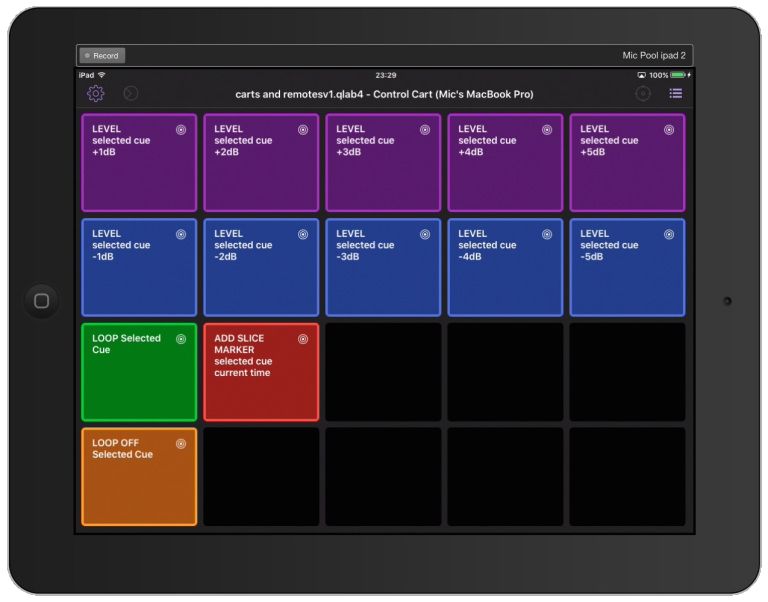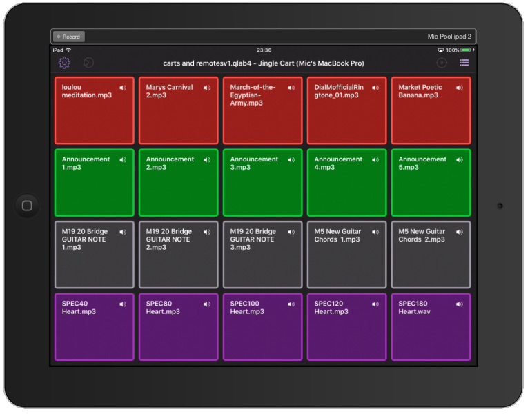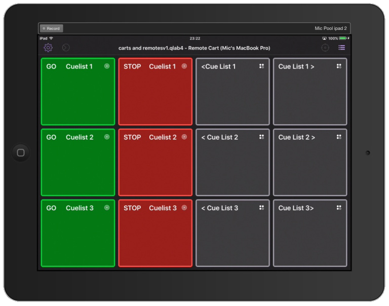 There are six cart controllers available which can be used on screen with the mouse, hotkeys, or MIDI triggers. They can also be viewed and operated as touch screens on iOS devices using QLab Remote.