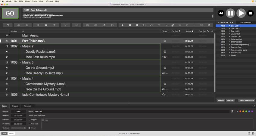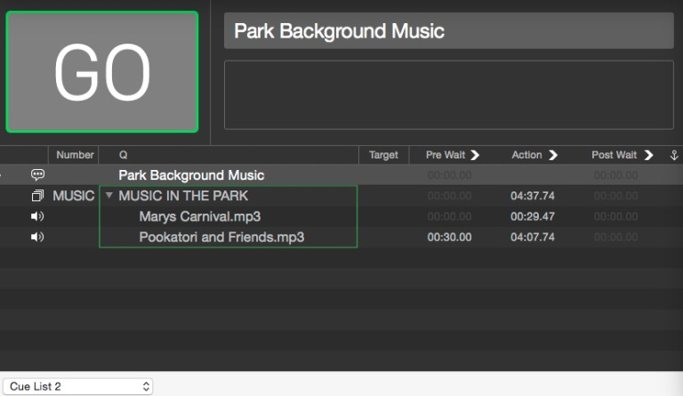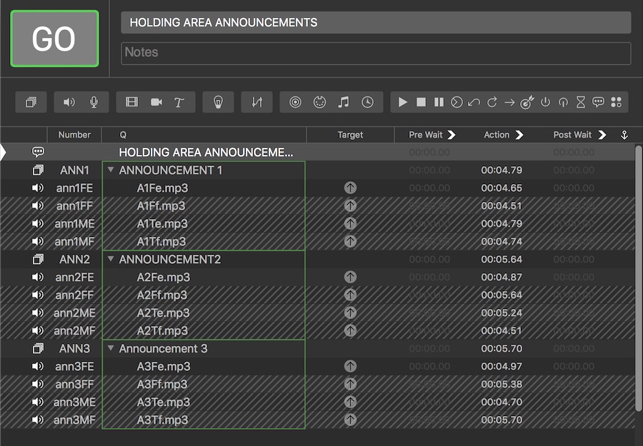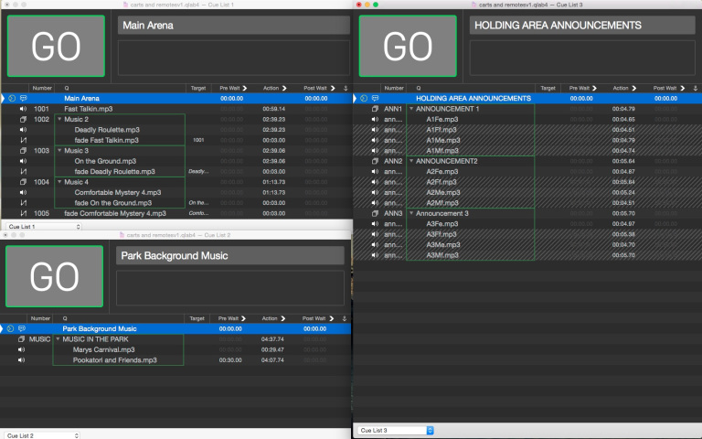 “Cue List 1” contains the cues for the main arena show, “Cue List 2” has some music cues which are played occasionally in the park surrounding the arena, and “Cue List 3” has some announcements which are played into the holding area outside the arena for the next audience. Cue List 3 has an additional feature allowing these announcements to be made by one of two announcers, each speaking either English or French.