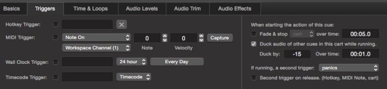 - Carts that can contain cues providing many utility functions, like adding slices to Audio or Video cues on the fly, changing the volume of selected cues, selecting understudy voiceovers and Video cues, etc.
