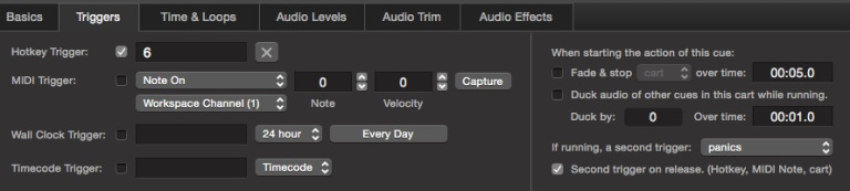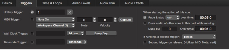 The cues in the bottom row are set to do their second trigger action, in this case to panic, when released.