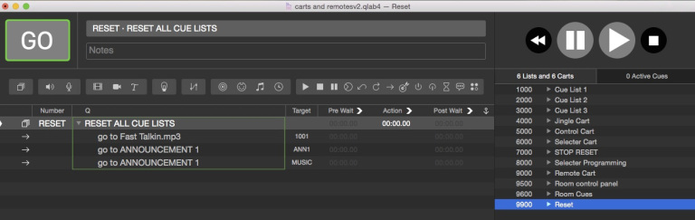 The reset button is a Start cue which targets the cue numbered RESET in the
