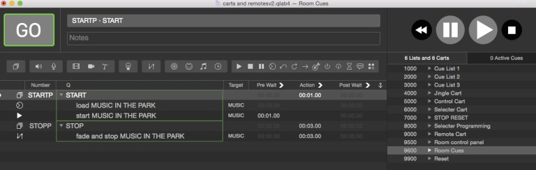 The start and stop buttons target cues in the Room Cues Cue List