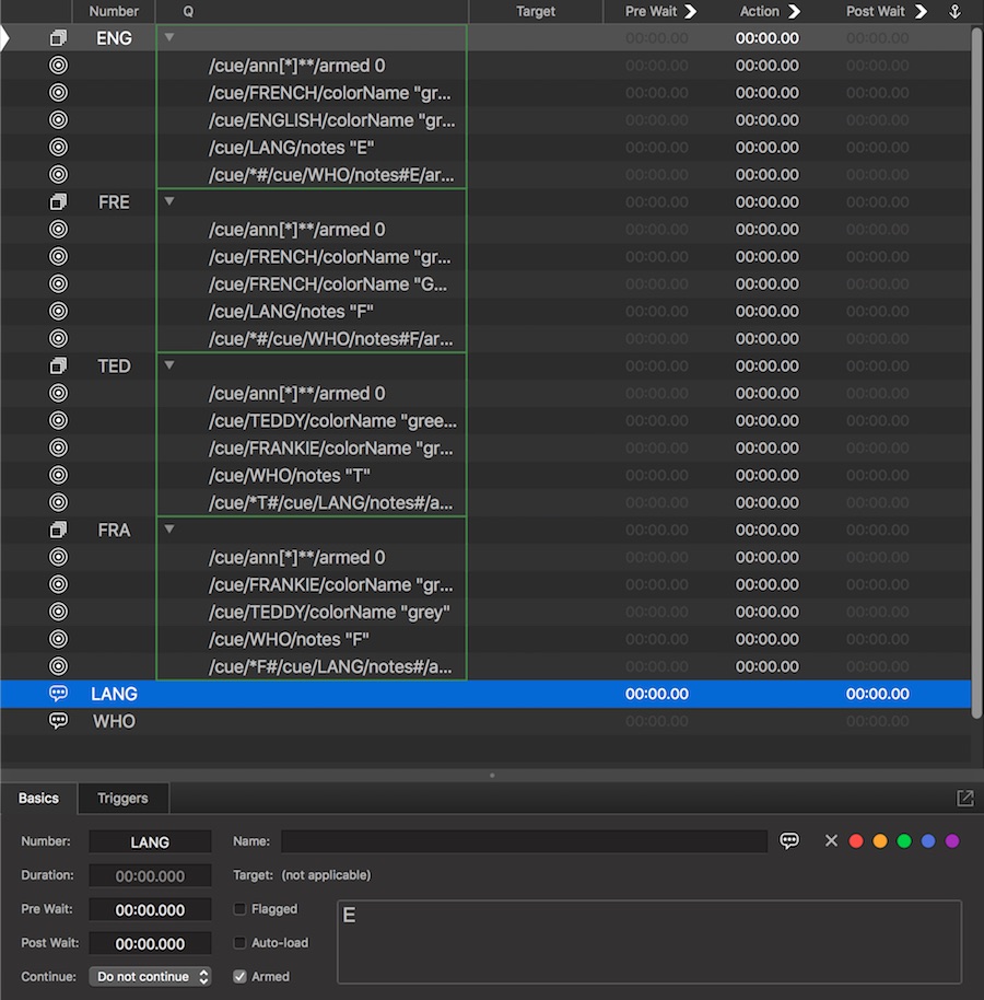 This sets the Notes field of the cue numbered LANG to “E”. We are using this to store “E” as a variable, indicating “English”. We send “F” when selecting French.