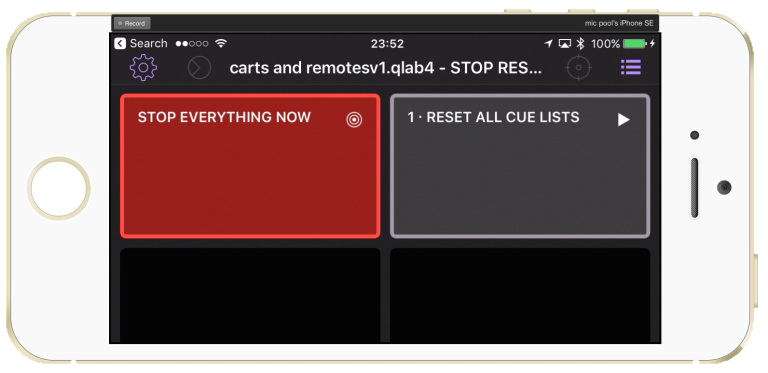 This workspace spans two large monitors and can have many iPads and iPhones connected via USB or wifi as touchscreen remotes. It has three cue lists visible and controllable simultaneously, and a master window (the main QLab workspace window) where all these lists can be edited by the show programmer. In addition, it has a number of carts which can be displayed on the screen or on iOS devices running QLab Remote to provide easy access to a whole range of functions.