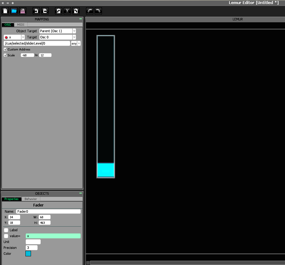 In Lemur Editor on the Mac, drag a Fader object from the panel on the right side of the Lemur window. To keep things simple, we’ll give the faders in Lemur the same numbers as the QLab sliders that they’re going to control. With the new fader selected, look to the Properties tab of the Objects panel in the lower left of the Lemur Editor window. There, change the name of the fader to “Fader0”.