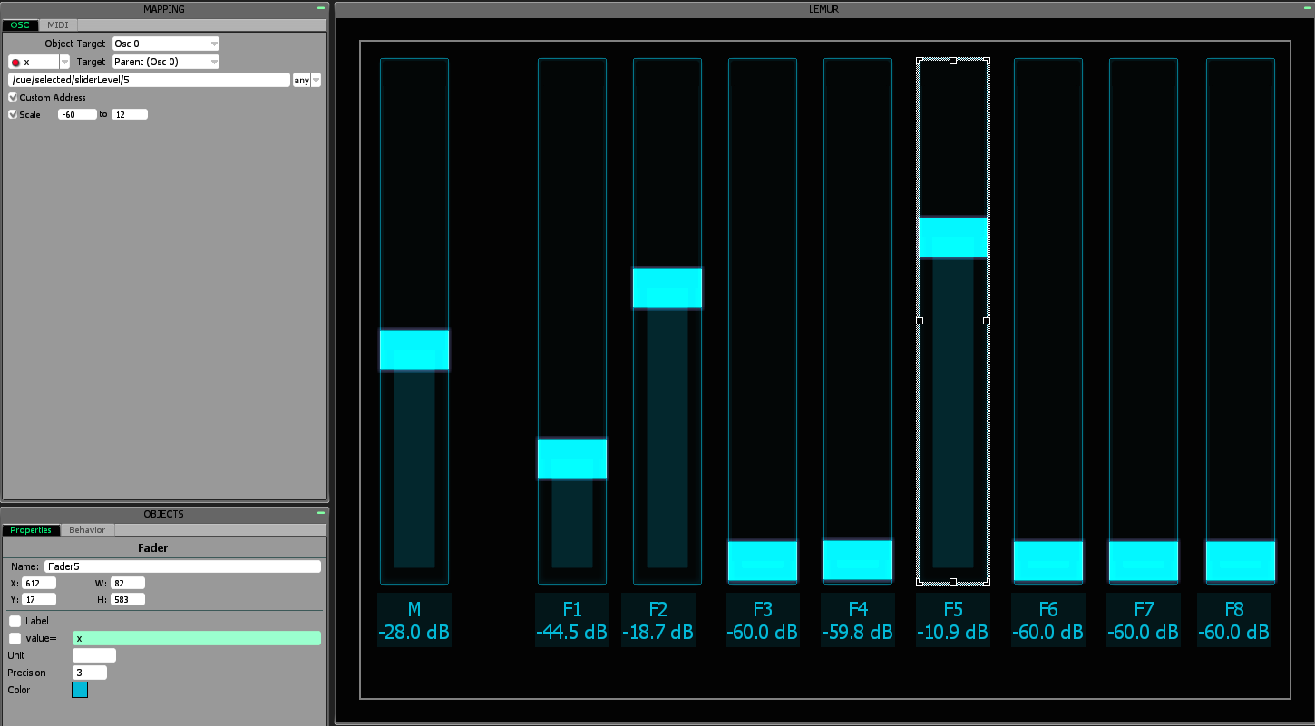 Lemur Fader objects produce an OSC output between 0.0 and 1.0, which is why we adjusted the Scale boxes to re-scale that output to a range of -60 to 0. We’ll want the Monitor object to display values scaled to this range as well.