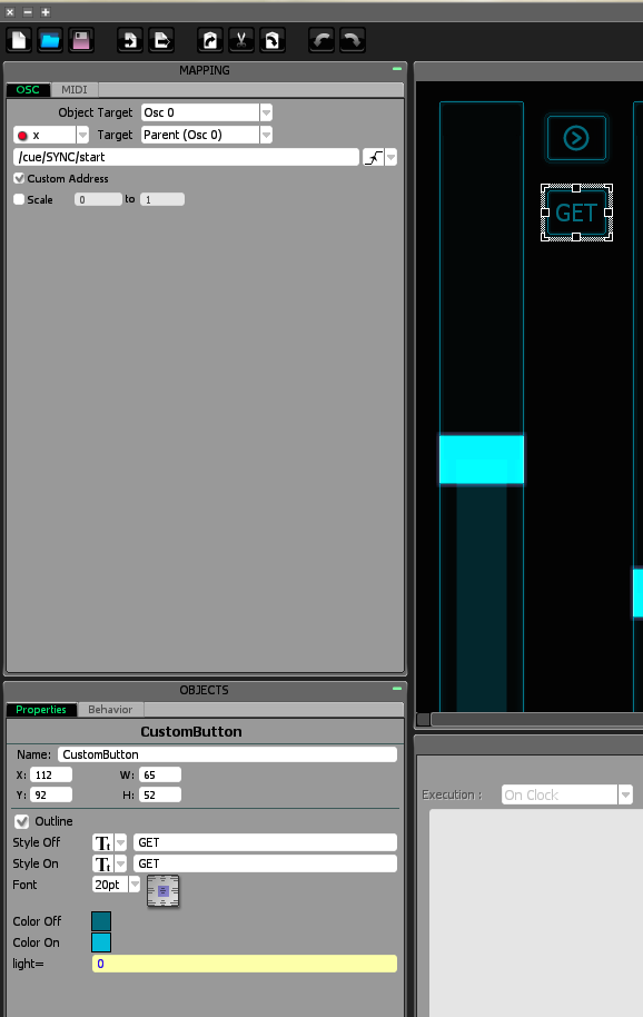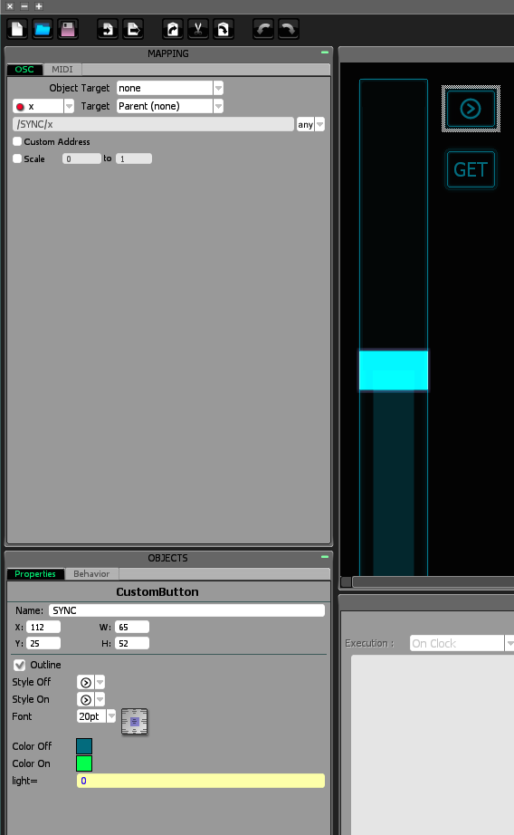 Let’s add a button to turn our OSC sync system on and off. Start by dragging a CustomButton object into the Lemur workspace. Name it “SYNC” and set its Color On to green and both its Style Off and Style On to the play symbol. That’s done by clicking on the button that’s labeled “Tt” and choosing the symbol from the drop-down menu.