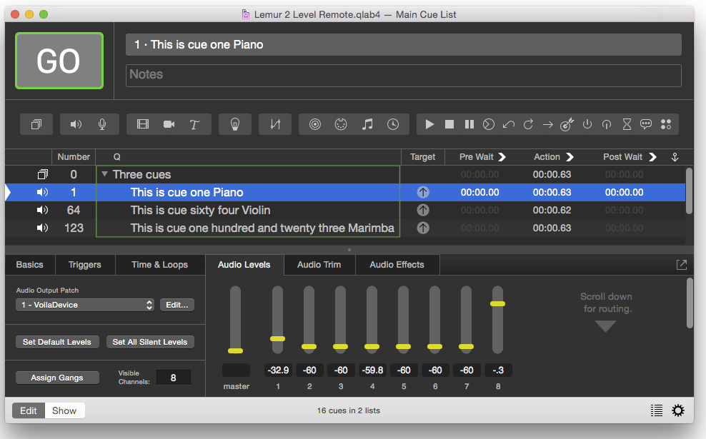 Each of the Audio cues is an eight-channel WAV file containing repeated notes played on a single instrument. Each of eight notes of the C major scale, C-C, are on separate tracks.