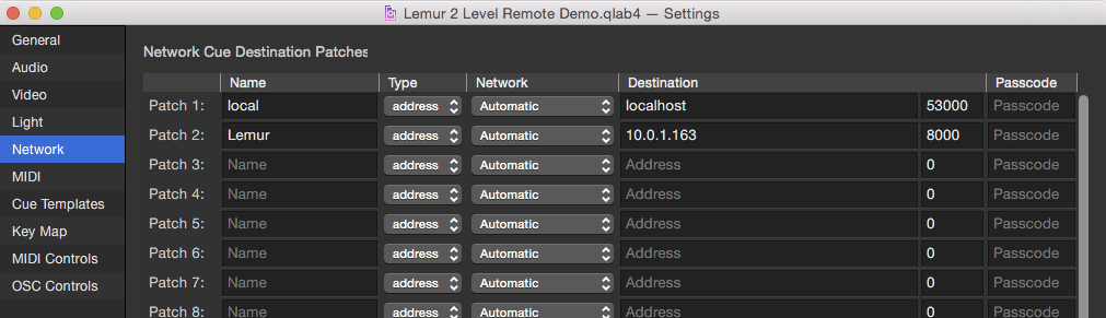 The first step is creating a network patch in QLab which will allow it to send OSC messages to Lemur.