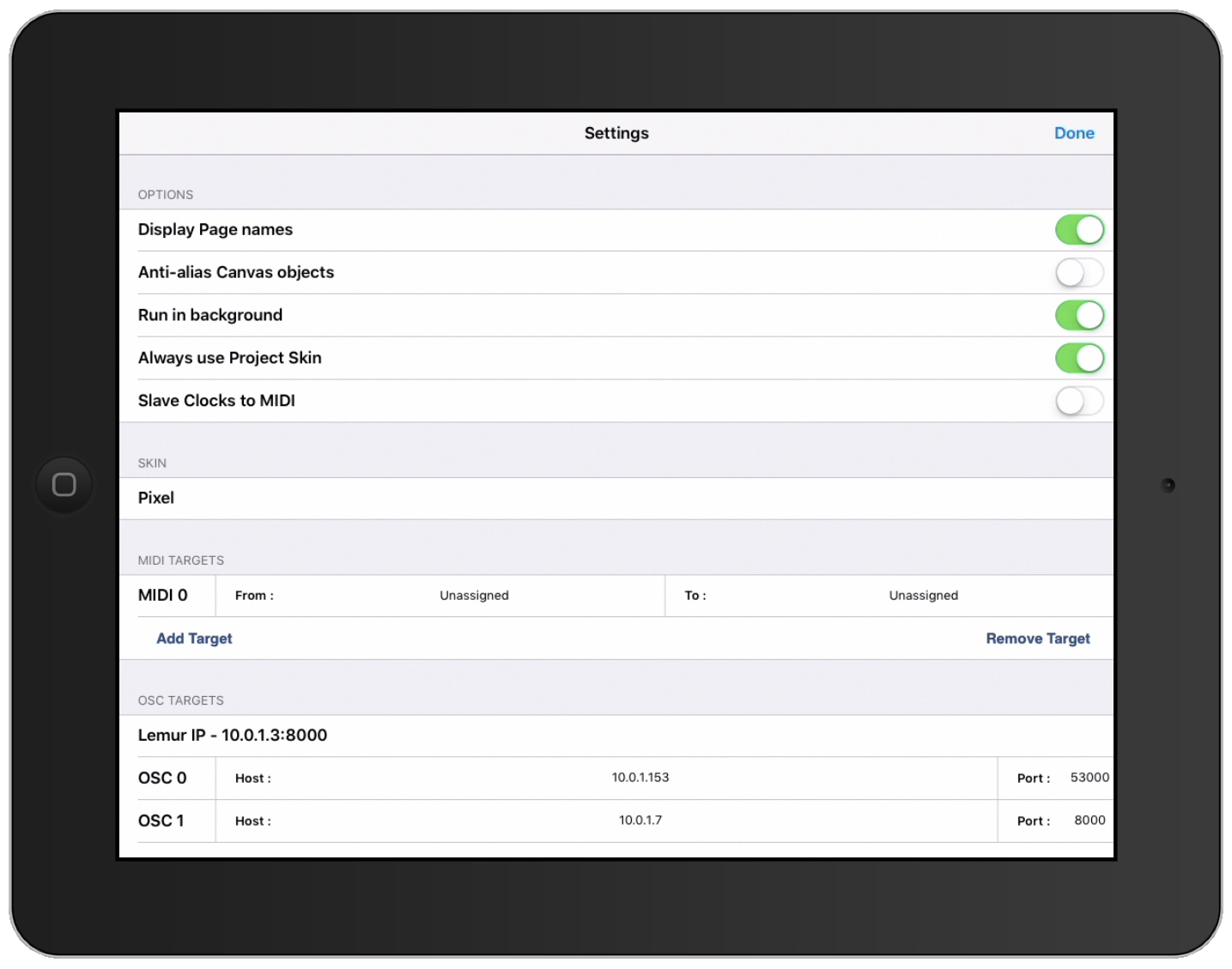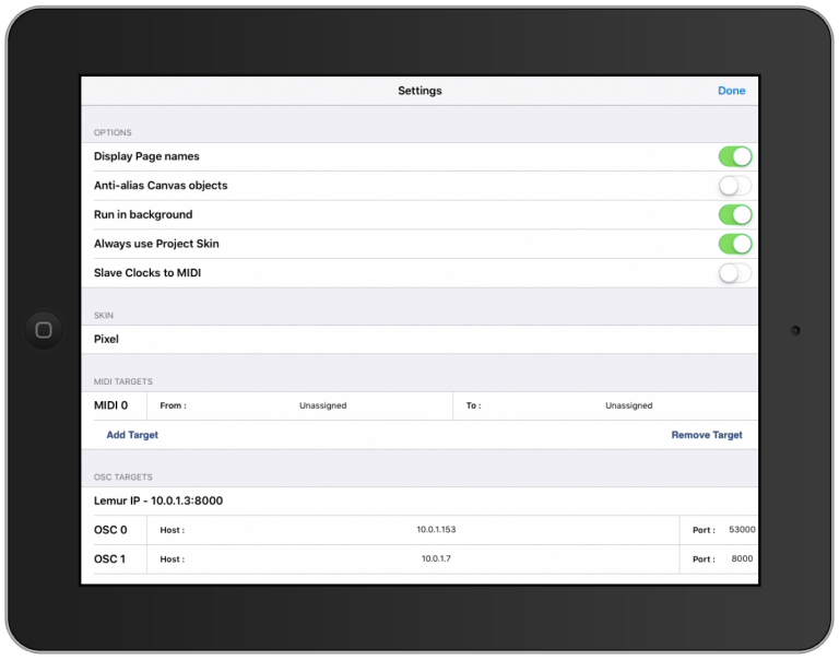 Under OSC Targets, which are analogous to QLab’s network patch destinations, connect OSC 0 to your Mac entering the Mac’s IP address into the Host field and 53000 (the port on which QLab listens for OSC) into the Port field. Then tap Done.