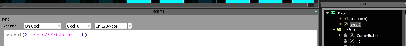 Create another script at project level named “sync”. Set its Execution to “On Clock” which will cause two more drop-down menus to appear. Set the first to “Clock 0” and the second to “On 1⁄8 note”