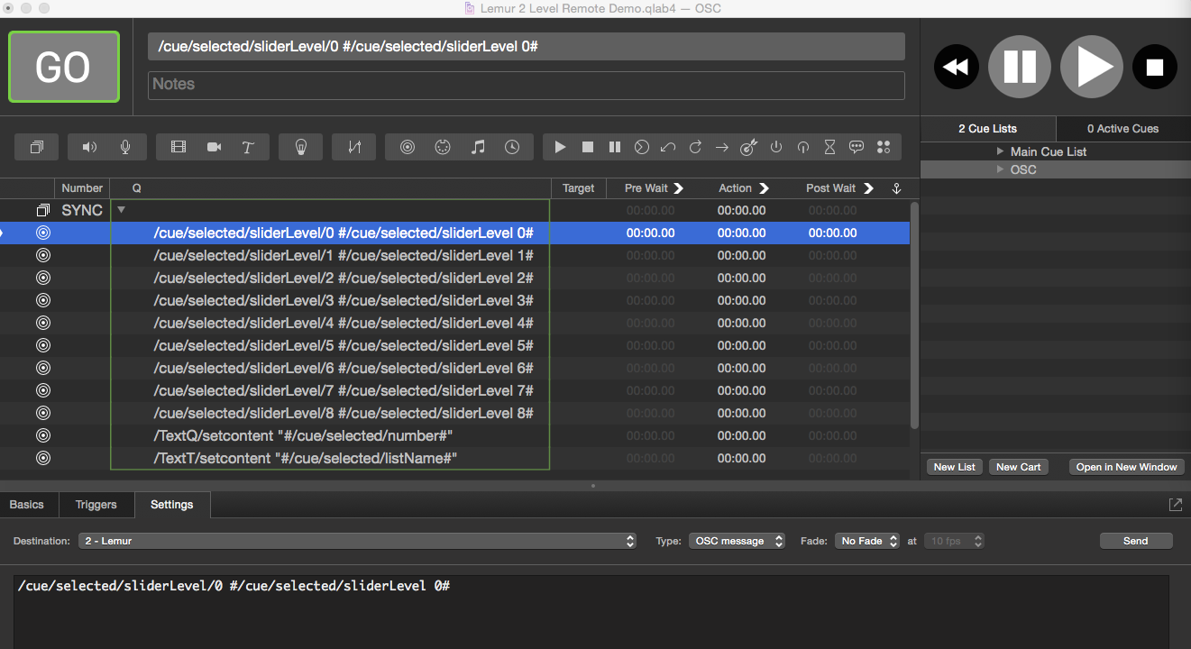 This uses an OSC query (the part between the hash marks) to get the current level of slider 0 (master) of the currently selected cue, and send that as the second argument of an OSC message beginning with /cue/selected/sliderLevel 0. That message will set the level of the fader in Lemur with the corresponding address, “Fader0” in this case, to the level of the slider in the selected cue.