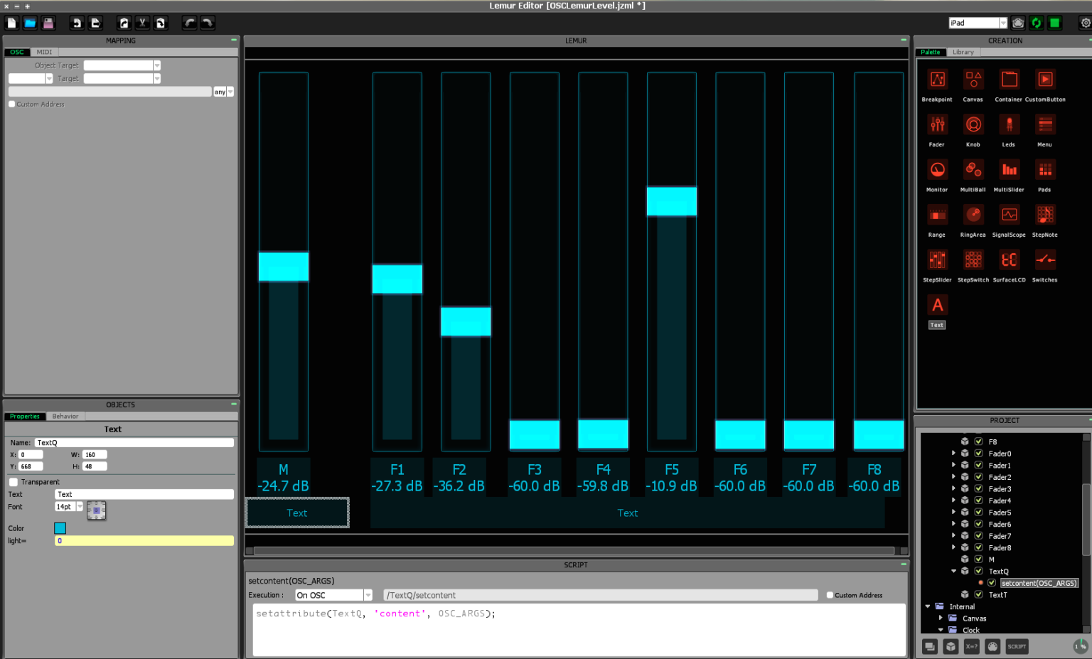 This tells Lemur to set the contents of the Text object named “TextQ” to the value of the OSC arguments every time the message /TextQ/setcontent is received. Later on, we’ll set up QLab to send that message with the appropriate arguments.