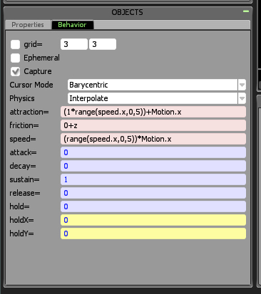 The Multiball object in Lemur is a controller object on steroids! It can have up to ten cursors, represented by balls. These balls have a full physics engine, so their speed, friction, and attraction to the operator’s fingers can all be controlled either directly or through mathematical expressions.
