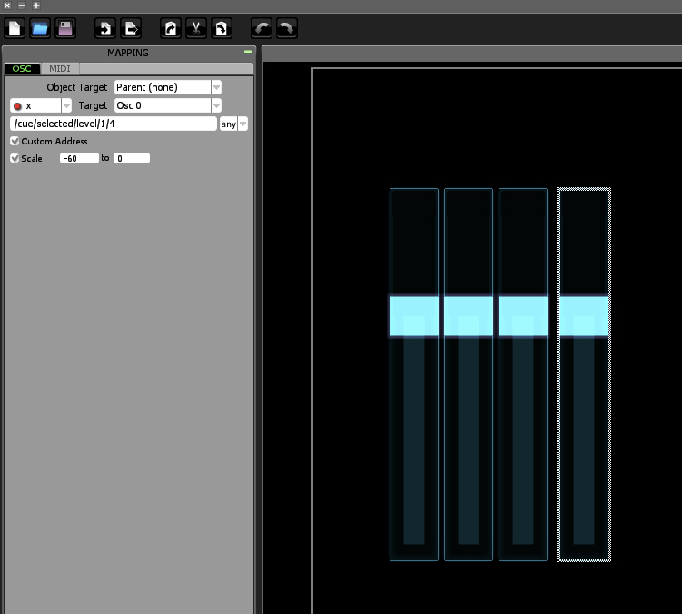 First, we will create four faders and set them up to send OSC messages to control the QLab crosspoints.