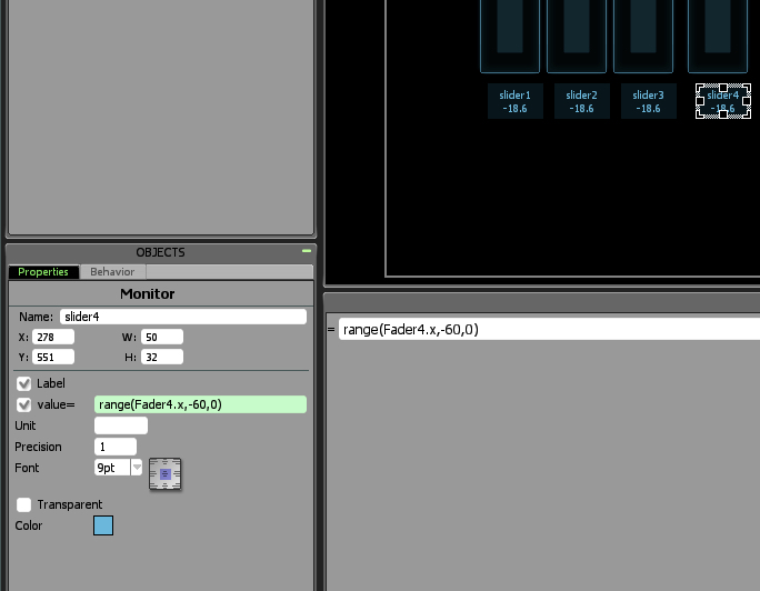 One all four faders are working, we can label them. Monitor objects can be used to both label the faders and display their values.