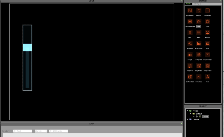 In Lemur Editor on the Mac, drag a fader object from the palette to the left of the Lemur work area.