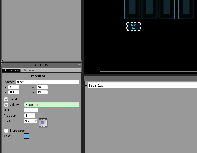 Drag a Monitor object from the palette and place it beneath Fader 1. In the Properties panel in the lower left of the editor, name it slider1.