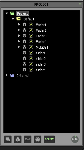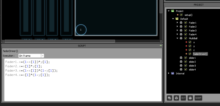 Highlight the Multiball object in the Project pane and click the script button. Make a new script with the name faderDriver which will be nested under the Multiball object. Select the script in the Project window, and set the execution to frame, which means the script will execute 60 times per second. Then, type the following in the script window: