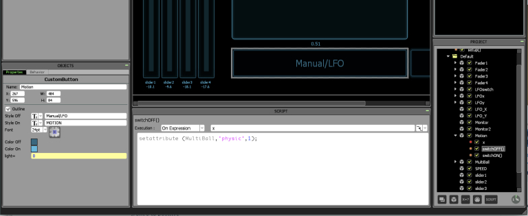 In the Project panel, select Project and create a new script by clicking the Script button. Name the script “LFO”, set the execution to On Frame, and type this in the script window: