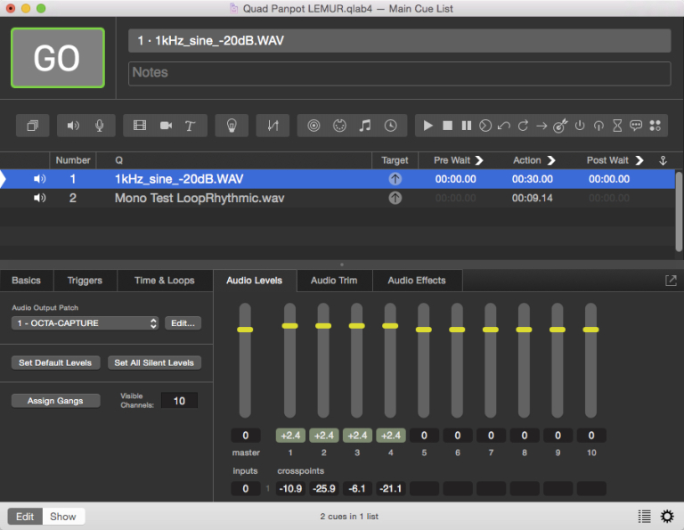 Because the values shown in QLab’s crosspoints do not update continuously, the thing to watch are the level meters in the cue outputs. The video uses a sine wave as the target of the Audio cue so that you can see what’s happening as clearly as possible.