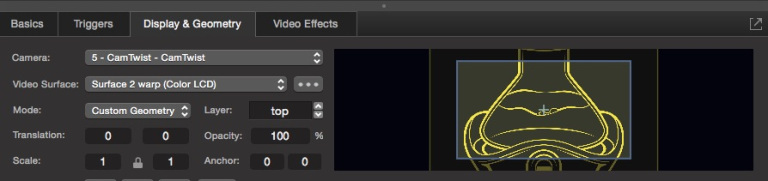 The Camera source is CamTwist (or Syphoner); the video surface is the surface with the perspective warp applied; Geometry is custom with no translation and a scale of 1.