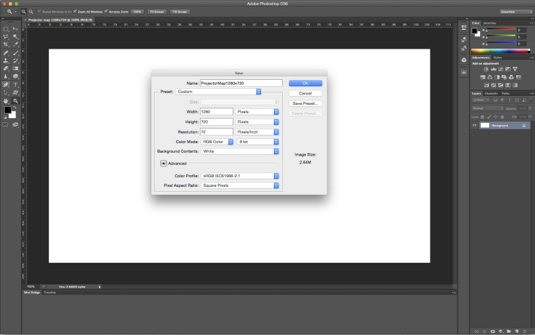Create a new document with a white background, with dimensions identical to your projector’s resolution. In our example, we’ll use 1280x720.