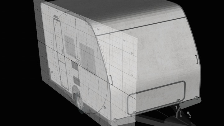 We now need to trace the shape of the trailer side and the windows to make our mask, but because of the warp on the QLab surface we no longer have a 1-to-1 relationship between any Photoshop document and the projector.