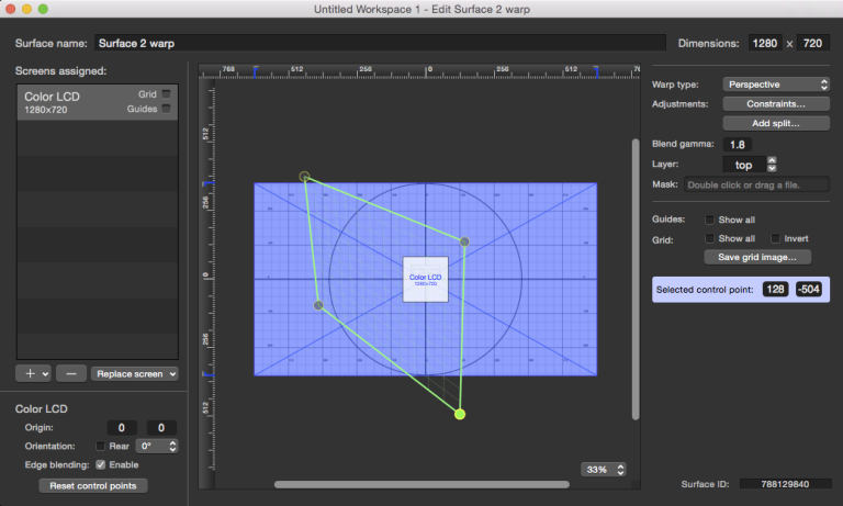 In order to retain the proportions of the original images, we are going to need an extreme perspective warp to be applied to the projector surface. We also need to keep horizontal lines in the projection truly horizontal, and verticals vertical. So, using the perspective warping tools in the video surface editor in QLab, we repeat our initial adjustment of the surface and maintain as much of the geometry of the original images as possible: