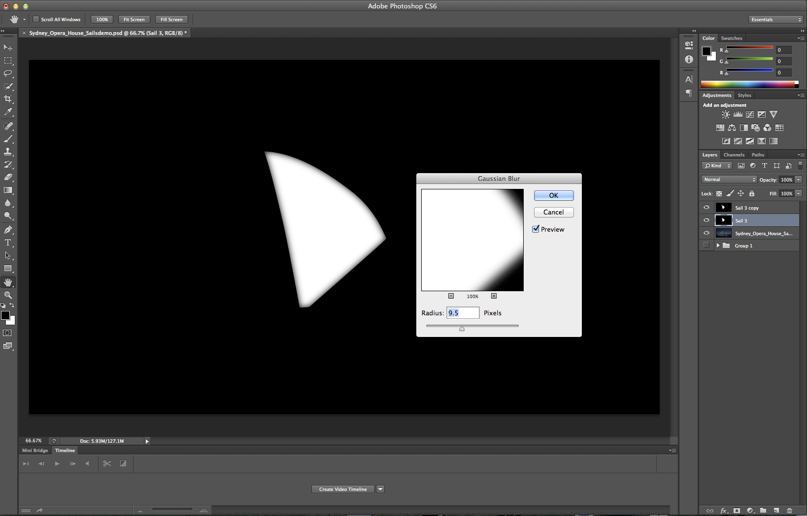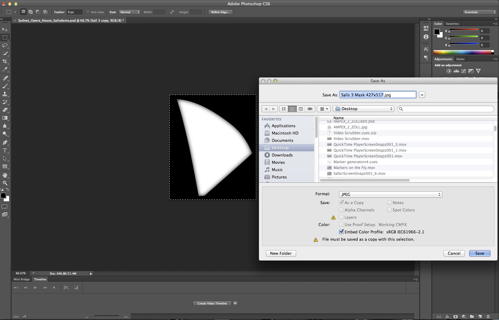 This illustrates the creation of the mask and surface for sail number 3. First in Photoshop, either on a photo taken at the projector position, or live on the actual set or building structure, the outline of the mask for the surface is traced using the pen tool.