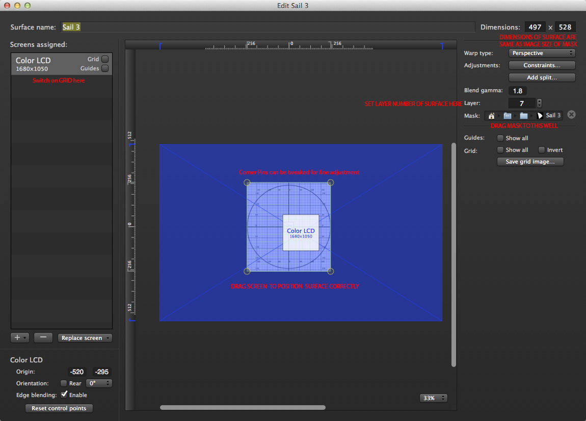 Each video surface is not much bigger than the masked area. This is so that the processor load of each surface is minimized. Also, if any small tweaks are needed, the corner pins for each surface are close to the area that surface maps, for easy manipulation. All the masks are slightly softened at the edges.