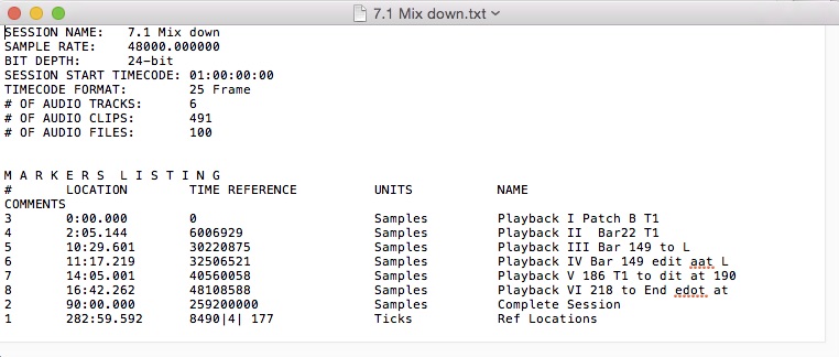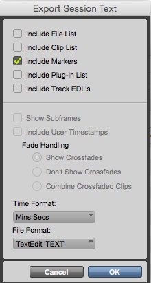 Then, choose Export Session Info As Text from the File menu and deselect everything apart from Include Markers Set Time Format to “Mins:Secs” and File Format to “TextEdit ‘TEXT’“.