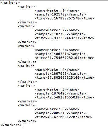 set sampleRate to do shell script “mdls ” & quoted form of POSIX path of thefile & ” | grep \”kMDItemAudioSampleRate\” | awk ‘{print $3}'”We need the sample rate so that we can include the sample number for the position of the marker in the .xml file