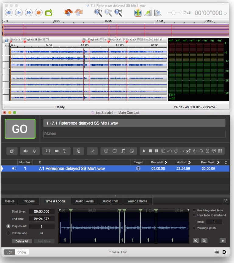 If you place markers in an audio file in TwistedWave and save the file, they show up as slices in QLab Audio cues that target that file.