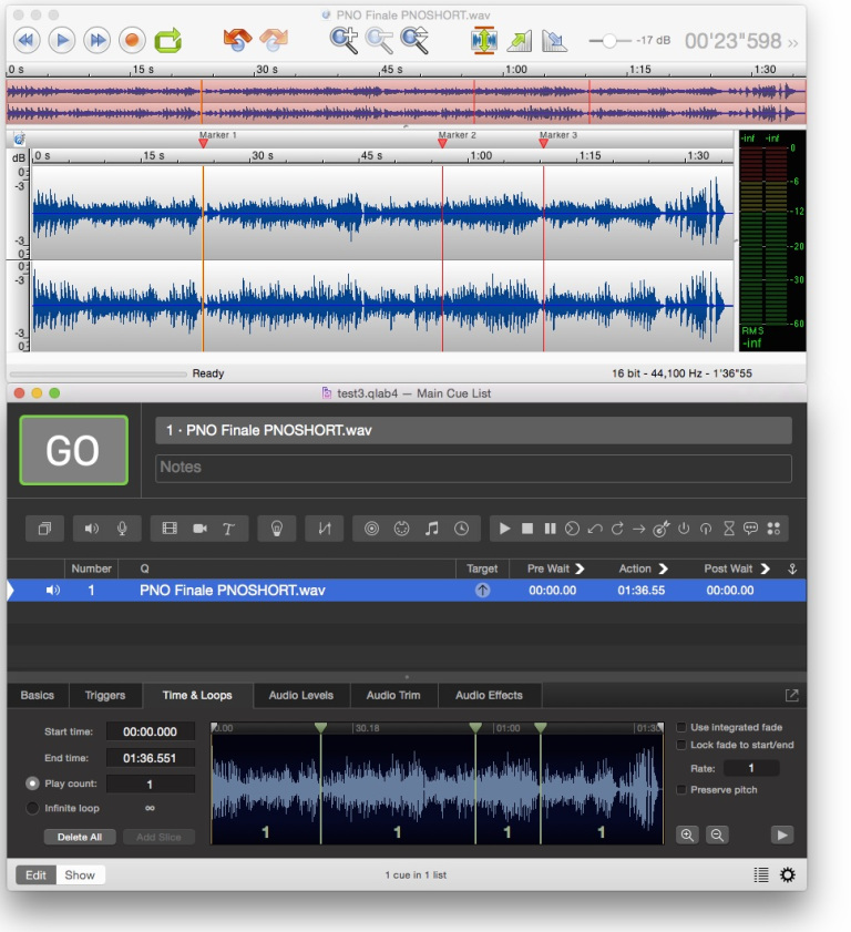 Remember, QLab never edits the source file, so no matter what happens in QLab, the audio file and its internal markers will never be altered.