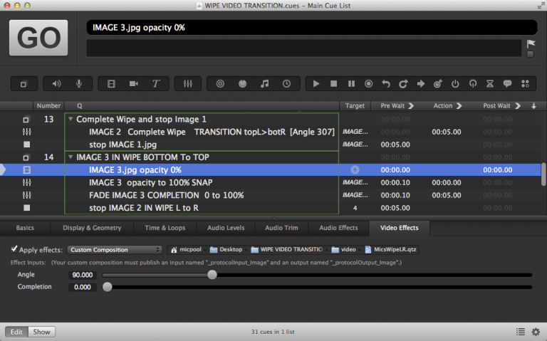 Each Video cue that needs a transition uses a custom Quartz Composer file inserted as a video effect. We’ll look at how the custom Quartz Composer file is created in a moment, but here is a screen shot of a Video cue with a custom Quartz Composition named “MicsWipe.qtz” inserted as a Video Effect. Note that the Completion slider is at 0(%):