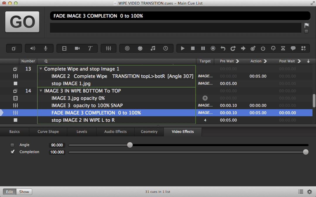 This workspace demonstrates using custom Quartz Composer filters in Video cues to enable transitions similar to the classic vision mixer “wipe” style.