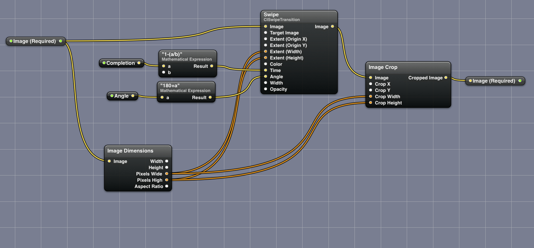The patch uses the Core Image Swipe Transition which is part of the built-in set of filters. The image is sent from QLab and arrives at the left-hand image port. From there it is fed to the Swipe filter and also to the Image Dimensions utility. This will extract the pixel width and height of the images that QLab sends to the patch. If you follow the patch cords you will see that these are used by the filter to determine the geometry of the transition, and also by the Image Crop utility which takes the output of the filter and ensures it can be rendered by the Quartz engine before being sent back to QLab. We are also publishing two parameters of the Swipe transition filter.