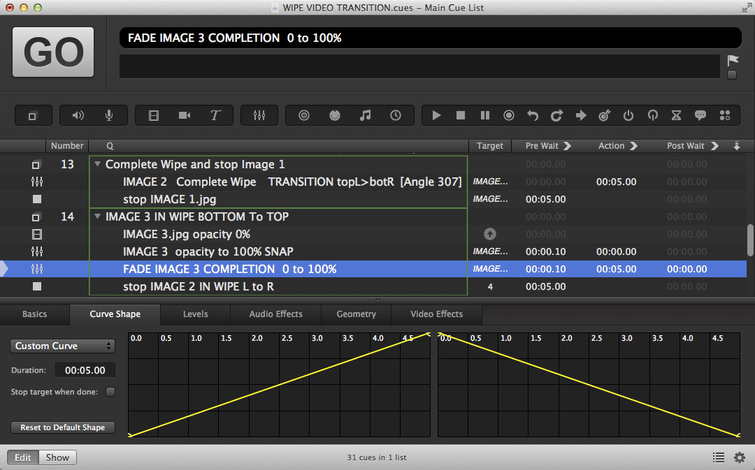 Cue 2 in the workspace flickers when the first cue with a transition effect is loaded or played. This is fairly common with video effects on cues and is a result of the delay in the video effect becoming active when the cue is triggered. Unfortunately, pre-loading makes no difference. To get around this, the example workspace delays making Video cues visible by starting them at 0% opacity, then using a Fade cue to snap them up to 100% after a 0.1 second delay. This gives the Quartz Composer filter sufficient time to “wake up”.