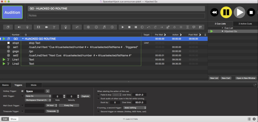 Sometimes you may wish to hijack the space bar so that when you use it to GO, you can execute some other actions in addition to the normal GO command. This might include logging a timestamp for the go, or some custom cue list behavior.