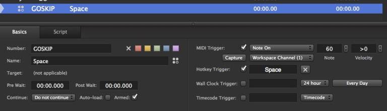 Next, create a Script cue and assign the space bar as its hotkey. If you use a MIDI device to trigger QLab, assign the message for your device’s GO button as the MIDI trigger for the Script cue as well: