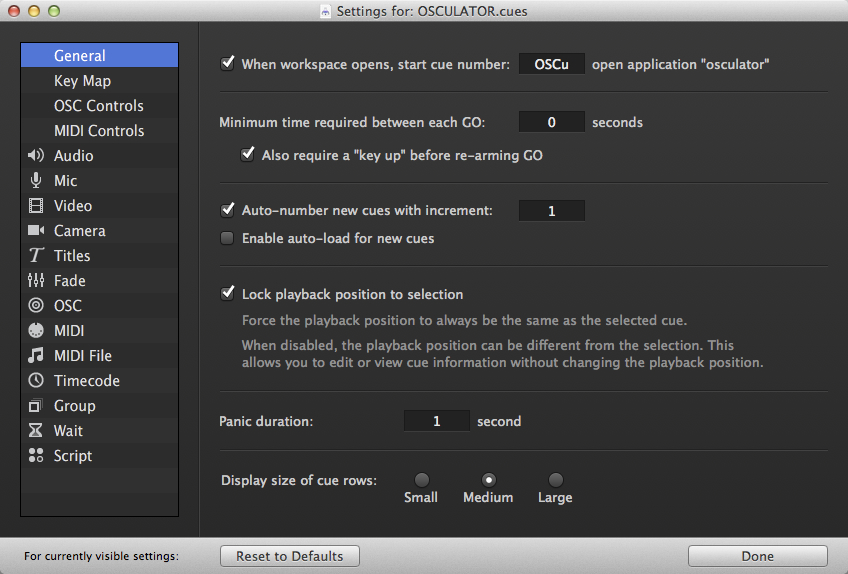 In Workspace Settings → General, we check the box marked “When workspace opens, start cue number” and enter the number of this cue, “OSCu”: