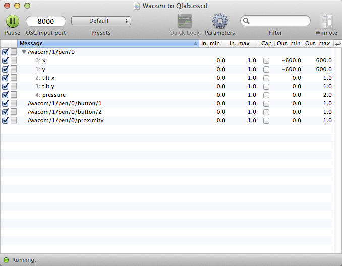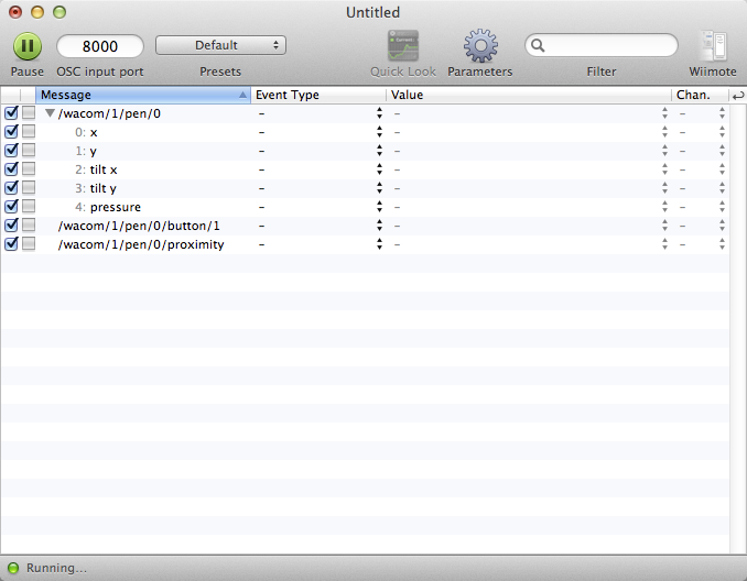 Close the Parameters window. Press caps lock on your keyboard and draw something with the pen on your Wacom tablet. The OSCulator main window will immediately populate with all the recognized parameters for tablets. Your tablet may not support all parameters, in particular, the cheaper ones don’t support pen tilt.