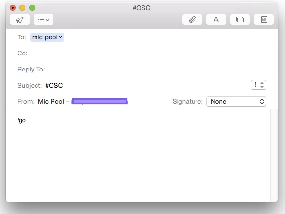 An email is sent with the subject line “#OSC”. This is received by Mail running