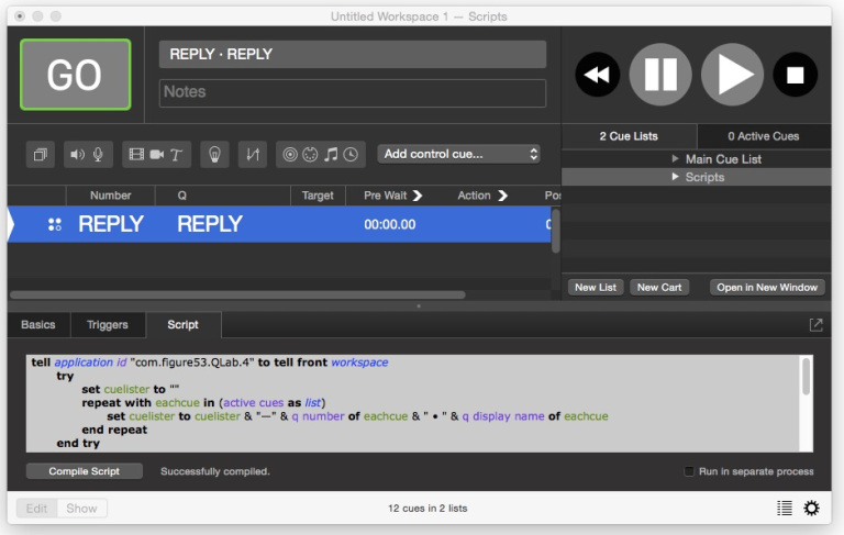 In the QLab workspace, we create a Script cue numbered REPLY (optionally in a