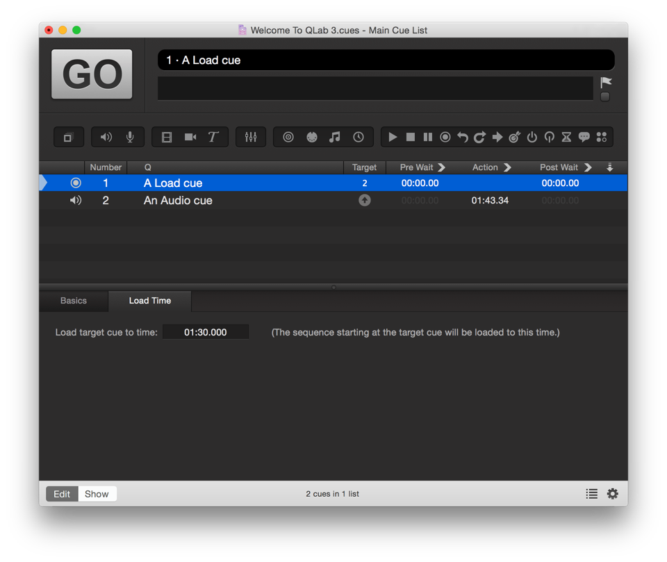 The Load cue loads its target cue. If the target cue has a non-zero action time, then you can load that target cue to a specific time via the Load Time tab in the inspector.