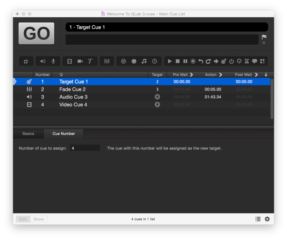 In the above screen shot, Target Cue 1 targets Fade Cue 2, and sets Fade Cue 2’s target to Video Cue 4.