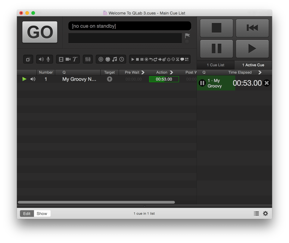 Each active cue is displayed in its own row, with its own controls. The row shows the cue number and name, and the elapsed or remaining time in larger text. You can toggle between showing elapsed time and remaining time by clicking on the chevron in the list header.