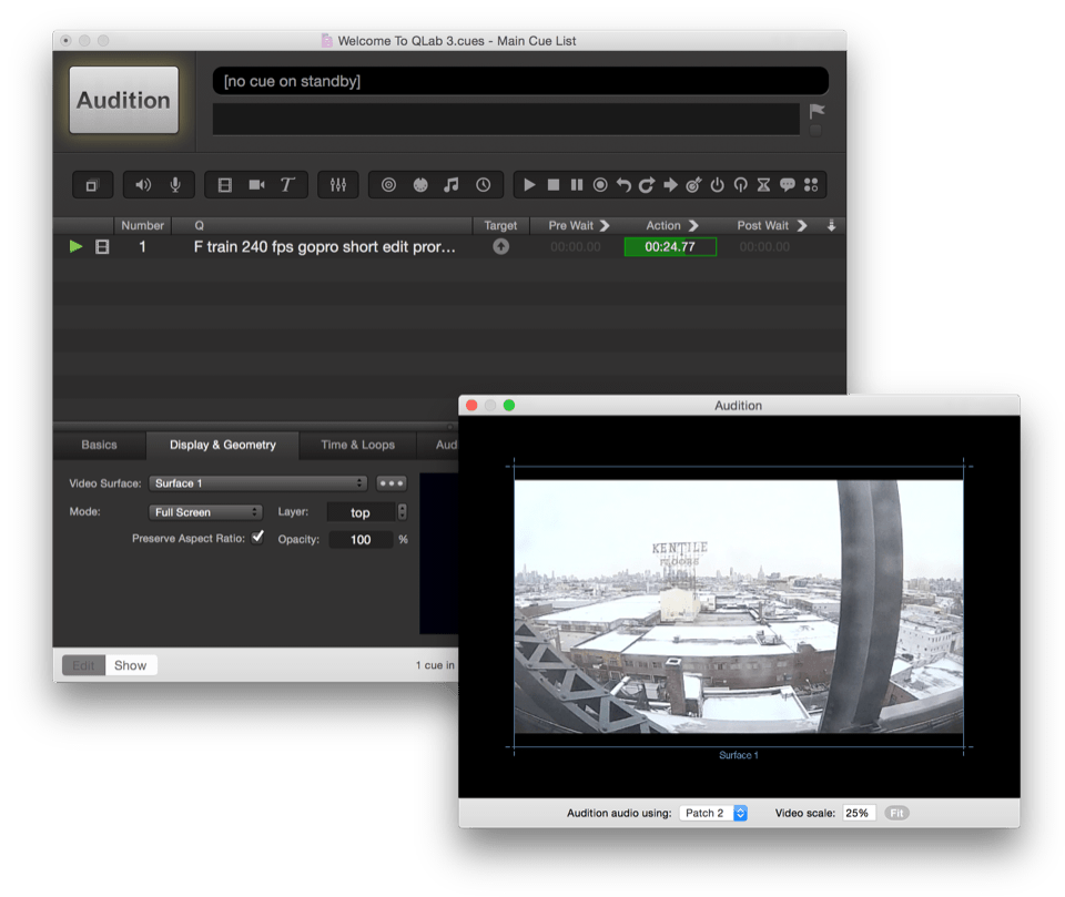 The Audition Window is a tool to listen to or watch cues privately without running them through your entire sound or video system. To access the audition window, select Audition Window from the Window menu or use the keyboard shortcut ⇧⌘A.