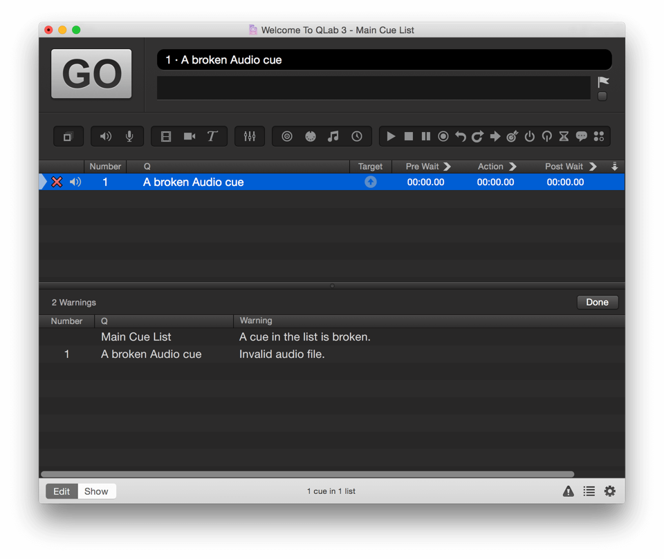 If your workspace contains any broken cues, a triangular indicator with an exclamation point appears on the right side of the footer (in addition to the red X beside each broken cue). Clicking the indicator opens the “Broken Cues and Warnings” panel, which contains a list of all the broken cues and a brief description of why they’re broken. Clicking on a cue in that list will jump the selection in the cue list to that cue.